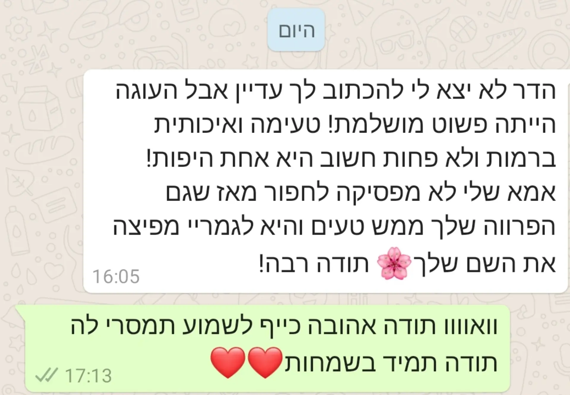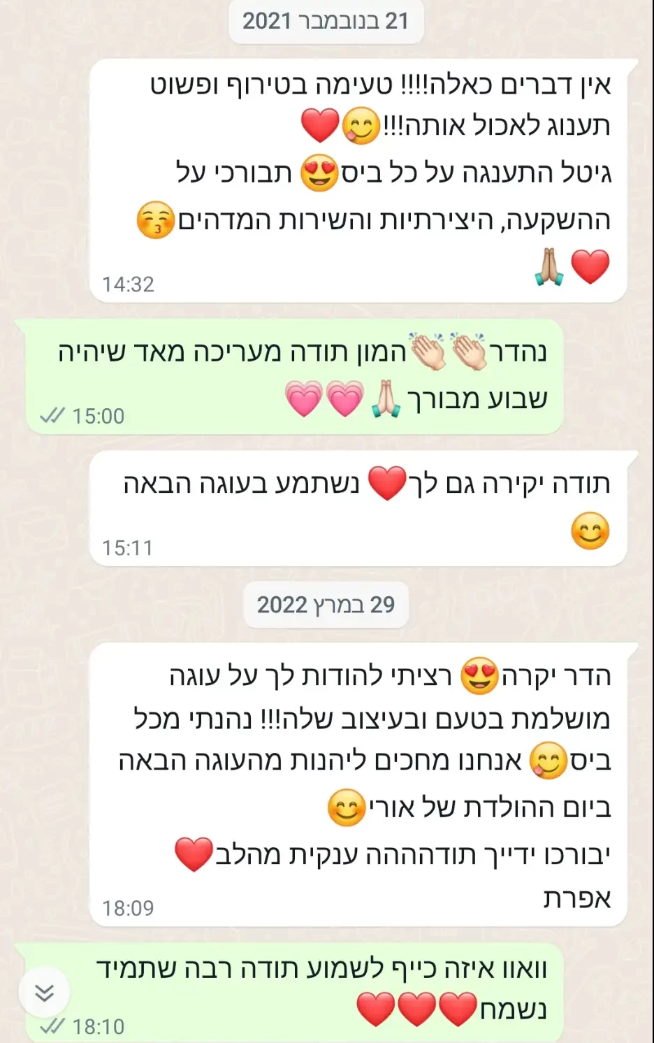 היי, שמי הדר טל, אם לארבעה ילדים, מעצבת ומוכרת עוגות וקינוחים מזה 6 שנים. בעלת המותג Happycake4u ובעלת ניסיון וידע רב שצברתי לאורך השנים בתחום האפייה והעיצוב. הבסיס כמובן הגיע מהבית. כילדה קטנה צפיתי המון באמא היקרה שלי, שאפתה לנו כל שישי עוגות ומאפים. בתחילת דרכי צברתי את הידע שלי דרך סדנאות רבות ומגוונות ובבינג'ים של ימים ולילות באינטרנט של מיטב המומחים, וכמובן דרך ניסוי וטעיה בעצמי. בעברי הייתי מעצבת גרפית וכך למדתי לשלב את האהבה שלי לאסתטיקה ועיצוב ולשלב אותו עם אהבה נוספת שלי בתחום האפייה ועיצוב העוגות. כעת, אני מרגישה שהגיע הזמן להוציא את כל הידע הזה החוצה שכל אחד ואחת יוכלו ללמוד לאפות ולעצב עוגות ומאפים טעימים, פריכים ומעוצבים גם אם אין להם ניסיון באפייה.